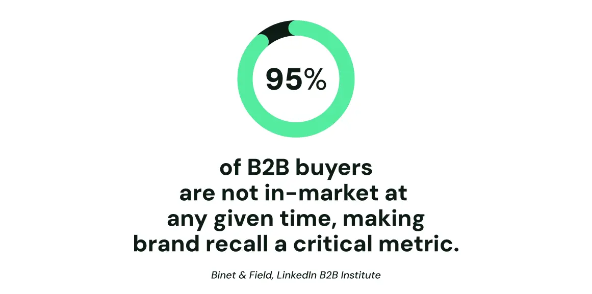 A landmark LinkedIn B2B Institute study showed that 95% of buyers are not in-market at any given time—meaning recall is what ensures you’re chosen when they are [5].